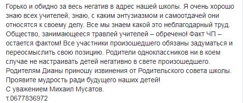 Он отмечает, что в итоге инцидента классный руководитель отстранена от должности, директору грозят оргвыводы, а "на педагогический коллектив вылиты реки грязи в интернете". "Общество, занимающееся травлей учителей - обречено! Факт ЧП - остается фактом! Все участники произошедшего обязаны задуматься и переосмыслить свою позицию. Родители одноклассников ни в коем случае не настраивать детей негативно в свете произошедшего. Родителям Дианы приношу извинения от Родительского совета школы. Проявите мудрость ради будущего наших детей!", - подытожил Мусатов.