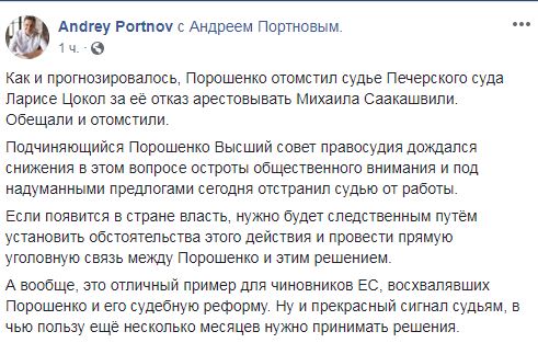 Юрист Андрей Портнов считает, что президент Петр Порошенко отомстил Цокол за ее отказ арестовывать Михаила Саакашвили. "Обещали и отомстили. Подчиняющийся Порошенко Высший совет правосудия дождался снижения в этом вопросе остроты общественного внимания и под надуманными предлогами сегодня отстранил судью от работы", - отметил он в Facebook.