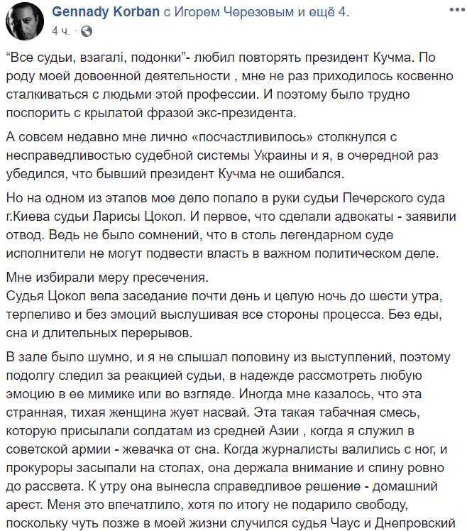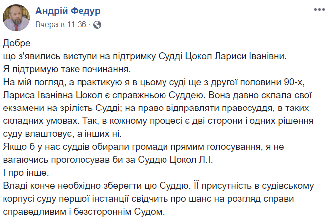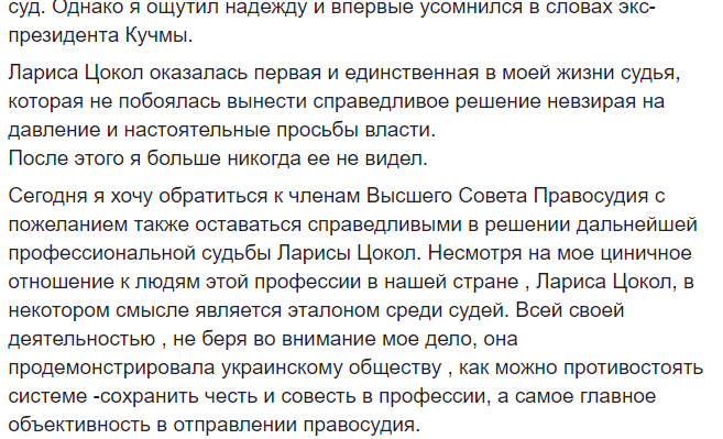 Сегодня я хочу обратиться к членам Высшего Совета Правосудия с пожеланием также оставаться справедливыми в решении дальнейшей профессиональной судьбы Ларисы Цокол. Несмотря на мое циничное отношение к людям этой профессии в нашей стране , Лариса Цокол, в некотором смысле является эталоном среди судей. Всей своей деятельностью , не беря во внимание мое дело, она продемонстрировала украинскому обществу , как можно противостоять системе -сохранить честь и совесть в профессии, а самое главное объективность в отправлении правосудия".