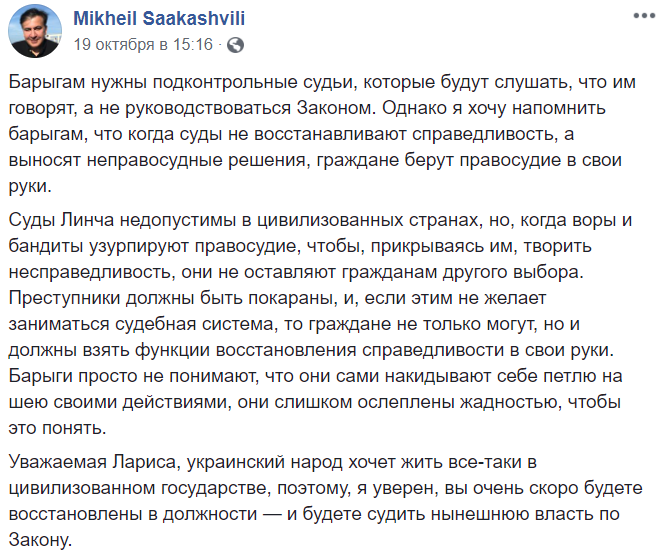 Уважаемая Лариса, украинский народ хочет жить все-таки в цивилизованном государстве, поэтому, я уверен, вы очень скоро будете восстановлены в должности — и будете судить нынешнюю власть по Закону".