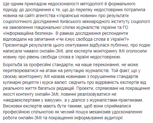 "Выводы авторов мониторинга, по нашему убеждению, являются поверхностными, имеют признаки формализма и вызывают много вопросов у журналистского сообщества. Вместо улучшения качества новостей исследование привело к публичным взаимным обвинениям представителей редакций и экспертов", - написал Томиленко.