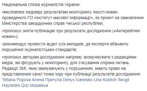 Так, НСЖУ выражает недоверие результатам мониторинга качества новостей, предлагает снять публикацию о результатах исследования, а также рекомендует провести аудит всех случаев, где эксперты видят нарушение журналистских стандартов.