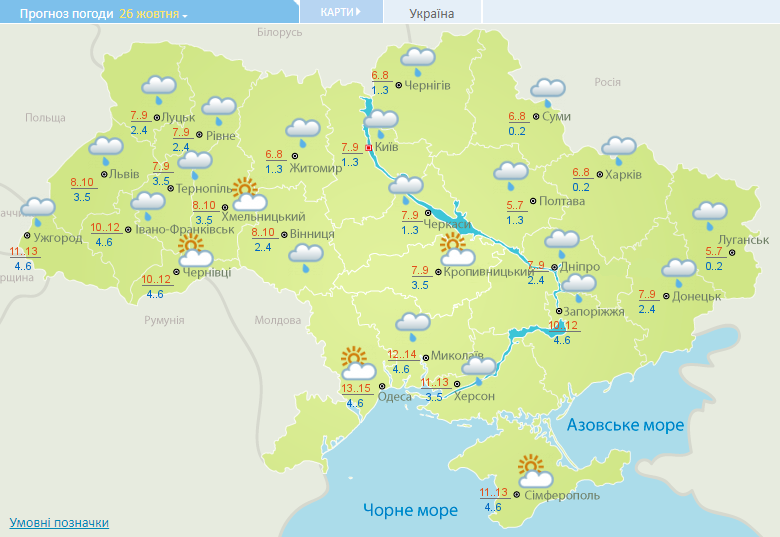 26 октября в Украине сохранится пасмурная погода. Об этом речь идет в прогнозе, опубликованном на странице Гидрометцентра в Facebook.