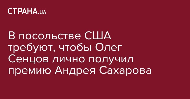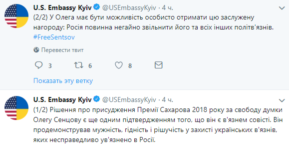 "Решение о присуждении премии Сахарова в 2018 году за свободу мысли Олегу Сенцову является еще одним подтверждением того, что он является узником совести. Он продемонстрировал мужество, достоинство и решительность в защите украинских заключенных, несправедливо удерживаемых в России. У Олега должна быть возможность лично получить эту заслуженную награду: Россия должна немедленно освободить его и всех остальных политзаключенных", - отметили в посольстве.