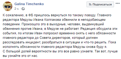 "Некоторое время назад случился неприятный инцидент. Ивана обвинили в неподобающем поведении. Иван Колпаков сам попросил меня на время снять с него обязанности главного редактора для того, чтобы совет директоров разобрался в ситуации и вынес взвешенное решение", - заявила она.