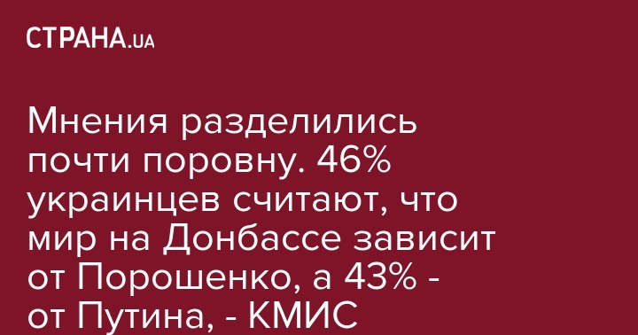 Согласно данным опроса, проведенного в сентябре 2018 года КМИС по заказу общественной организации "Детектор медиа", 30,4% опрошенных сказали, что установление мира на Донбассе зависит в целом от украинской власти, 16,5% - что в целом от российской власти, 10,4% - от власти так называемых "ДНР" и "ЛНР", 10,3% - от "удовлетворения интересов политиков на войне", 7,6% - от стран Запада.