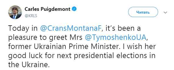 "Сегодня было приятно приветствовать госпожу Тимошенко, бывшего премьер-министра Украины. Я желаю ей удачи на следующих президентских выборах в Украине", - написал Пучдемон.