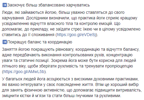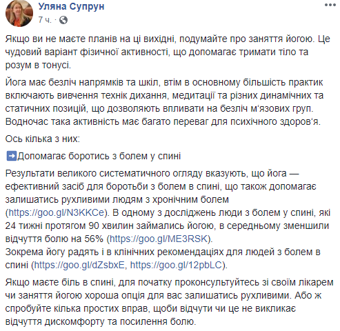 И. о. министра здравоохранения Ульяна Супрун расказала украинцам о йоге. По ее мнению йога является эффективным средством борьбы с болью в спине, помогает оставаться подвижными людям даже с хронической болью. Это прекрасный вариант физической активности, который помогает держать тело и разум в тонусе.