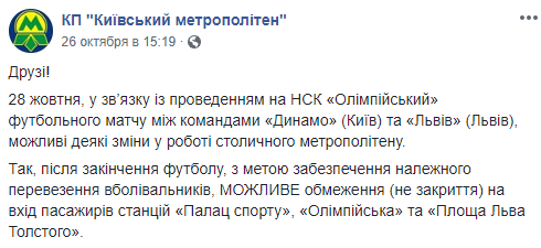 Отмечается, что в связи с проведением футбольного матча между командами "Динамо" (Киев) и ФК "Львов", возможны ограничения работы станций метро.