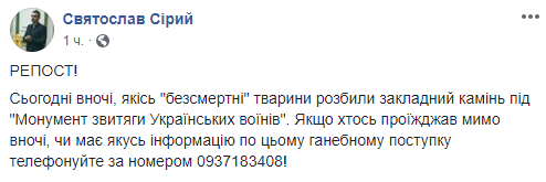 "Сегодня ночью какие-то "бессмертные" животные разбили закладной камень под Монумент доблести украинских воинов", - сказано в сообщении.