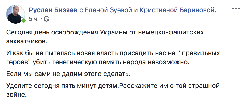 "Сегодня день освобождения Украины от немецко-фашитских захватчиков. И как бы не пыталась новая власть присадить нас на " правильных героев" убить генетическую память народа невозможно. Если мы сами не дадим этого сделать. Уделите сегодня пять минут детям.Расскажите им о той страшной войне", - призывает блогер Руслан Бизяев.