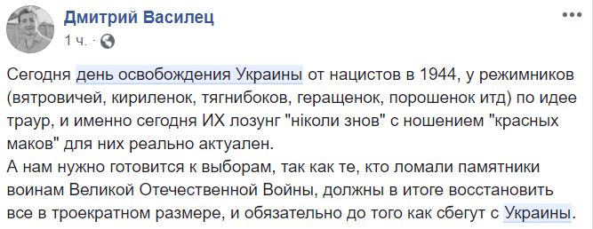 "Сегодня день освобождения Украины от нацистов в 1944, у режимников (вятровичей, кириленок, тягнибоков, геращенок, порошенок итд) по идее траур, и именно сегодня ИХ лозунг "ніколи знов" с ношением "красных маков" для них реально актуален.
