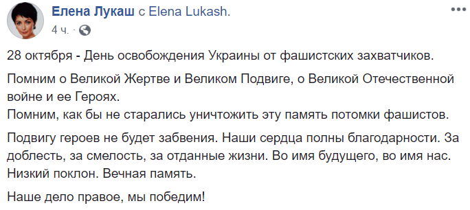"Друзья! Сегодня День освобождения Украины от немецко-фашистских захватчиков! Поздравляю с праздником! Наши отцы и деды победили фашизм и мы победим! Сейчас другое время и другая война. Но тем значительнее будет наша новая победа!"