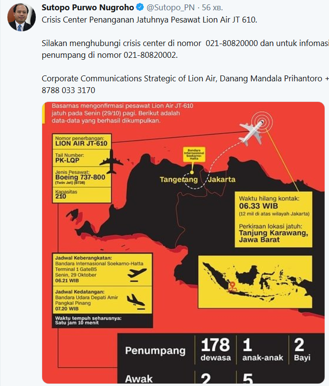 В понедельник, 29 октября,в Индонезии произошла авиакатастрофа. Пассажирский лайнер Boeing 737 исчез с радаров почти сразу же после взлета и набора высоты. Как выяснилось, самолет на борту которого находилось 189 человек - рухнул в океан.