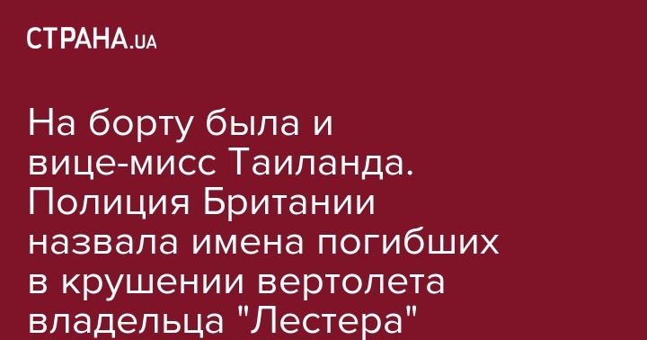 Как сообщила полиция, на борту воздушного судна находились владелец "Лестера", миллиардер Вишай Шривадданапрабха, пилоты 53-летний Эрик Сваффер и 46-летняя Изабелла Роза Лечович, помощник бизнесмена Кавепорн Пунпар и вице-мисс Таиланда-2005, 33-летняя Нусара Сукнамаи. Опознание тел состоится позже.