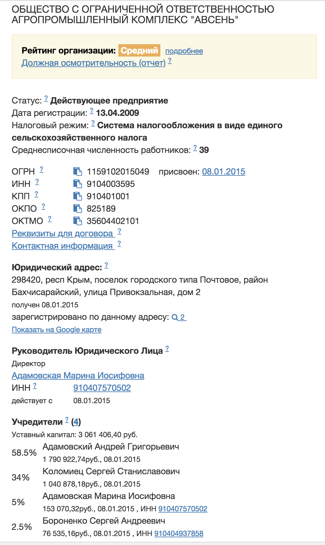 Интересно, что основной государственный регистрационный номер (в РФ такие есть у всех юридических лиц) фирме присвоен в 2015 году. При этом указывается, что предприятие действует с 2009 года. То есть учредители просто переоформили компанию в российской юрисдикции после аннексии полуострова.