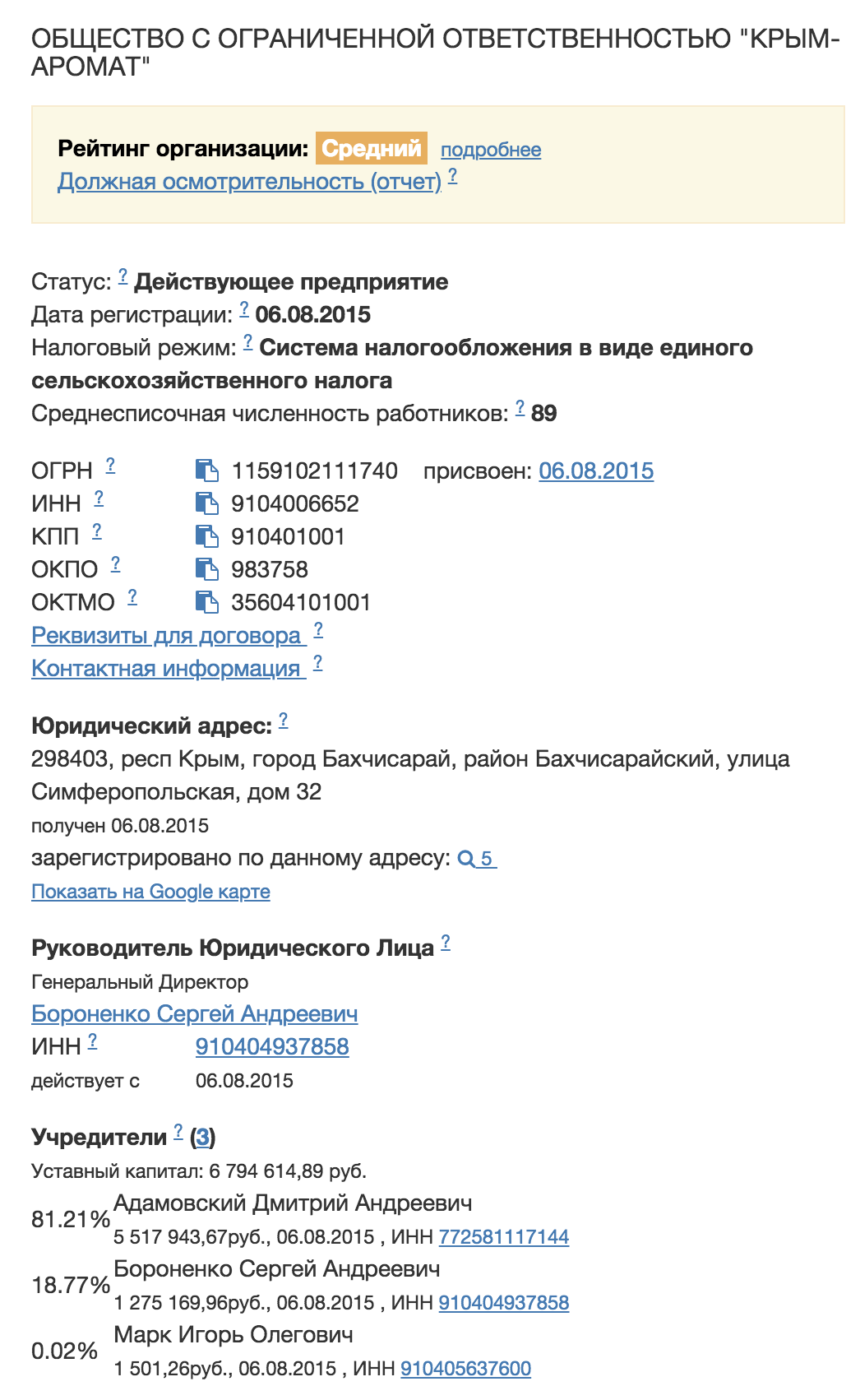 В обеих фирмах встречается Сергей Бороненко, который везде выступает как соучредитель, а в "Крым-Аромате" - еще и работает директором. То есть оба предприятия явно связаны между собой.
