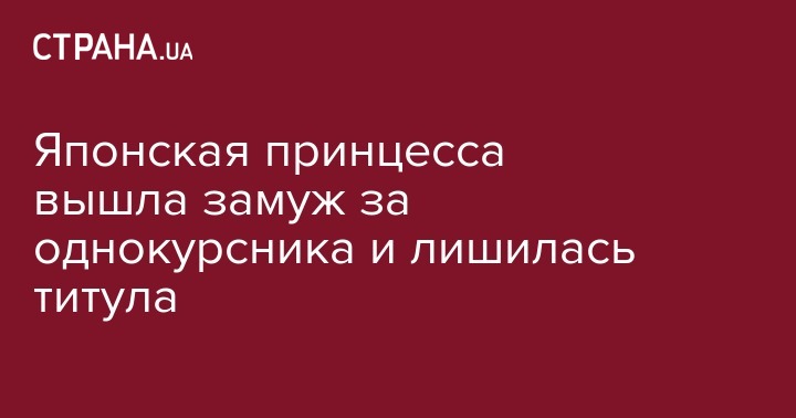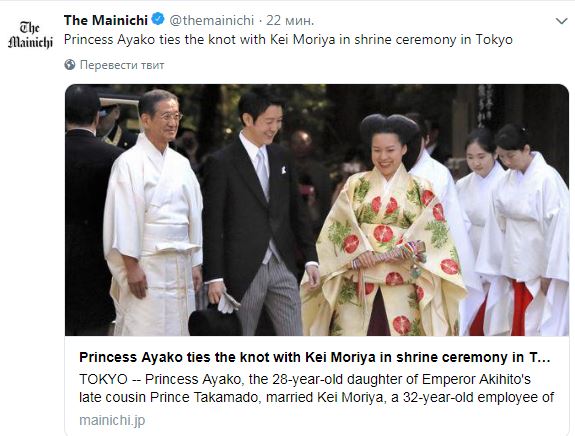 Японская принцесса 28-летняя Аяко вышла замуж за 32-летнего работника судоходной компани Nippon Yusen KK Кэя Морито и лишилась своего титула. Церемония прошла в Токио 29 октября, пишет The Mainichi в Twitter.