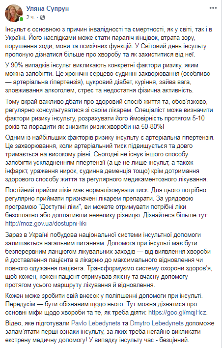 "Одним из самых больших факторов риска инсульта является артериальная гипертензия. Это заболевание, когда артериальное давление повышается и долго держится на высоком уровне. Сегодня не существует другого способа предотвратить осложнения гипертензии (а это не только инсульт, а также инфаркт, поражения почек, сосудистая деменция и т.д.) помимо соблюдения здорового образа жизни и регулярного медикаментозного лечения" – пишет Ульяна Супрун.