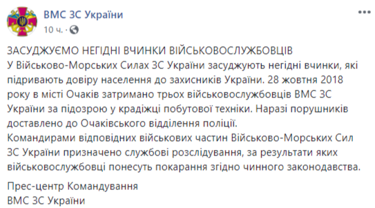 "В городе Очаков задержаны трое военнослужащих ВМС ВС Украины по подозрению в краже бытовой техники. В настоящее время нарушители доставлены в Очаковское отделение полиции", - говорится в сообщении.