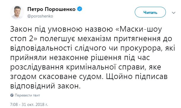 "Закон под условным названием Маски-шоу стоп 2 облегчает механизм привлечения к ответственности следователя или прокурора, которые приняли незаконное решение в ходе расследования уголовного дела, которое впоследствии отменено судом", - написал президент.