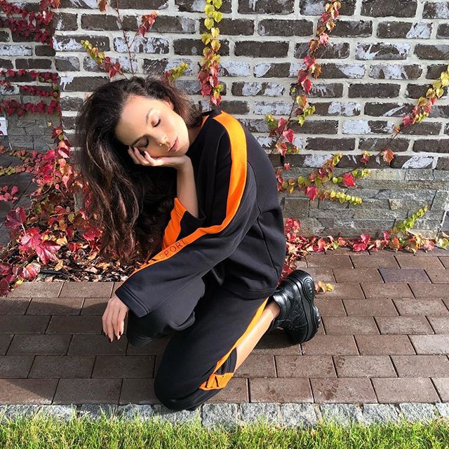 NK изящно присела на корточки в черно-оранжевом спортивном костюме. На фото заметно похудевшая певица позирует, закрыв глаза.