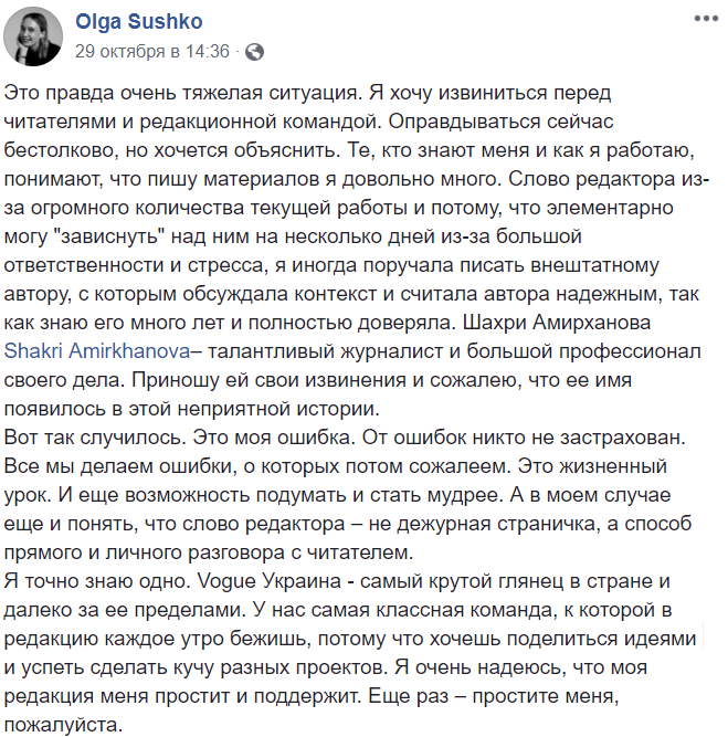 "Это правда очень тяжелая ситуация. Я хочу извиниться перед читателями и редакционной командой. Оправдываться сейчас бестолково, но хочется объяснить. Те, кто знают меня и как я работаю, понимают, что пишу материалов я довольно много. Слово редактора из-за огромного количества текущей работы и потому, что элементарно могу "зависнуть" над ним на несколько дней из-за большой ответственности и стресса, я иногда поручала писать внештатному автору, с которым обсуждала контекст и считала автора надежным, так как знаю его много лет и полностью доверяла. Шахри Амирханова Shakri Amirkhanova – талантливый журналист и большой профессионал своего дела. Приношу ей свои извинения и сожалею, что ее имя появилось в этой неприятной истории.
