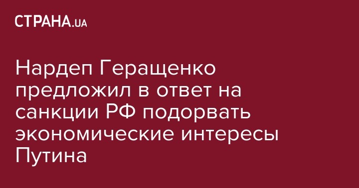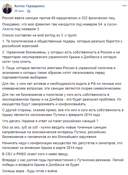 Народный депутат Украины (фракция "Народный фронт") Антон Геращенко прокомментировал в соцсети введение Россией санкций против физических и юридических лиц Украины. Он считает, что санкционный список состоит из трех групп и по его мнению, Украине следует вводить новые точечные санкции, направленные на экономические интересы президента РФ Владимира Путина, бизнесменов и чиновников из его окружения.