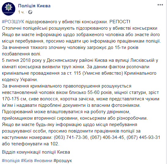Полиция Киева объявила в розыск подозреваемого в убийстве консьержки. По данным полиции, это мужчина в возрасте около 55-60 лет, крепкого телосложения, рост 170-175 см, седые волосы, короткая стрижка, может представляться чужим именем и предоставлять поддельные документы с собственным фотоснимком. Об этом сообщает отдел коммуникации ведомства.