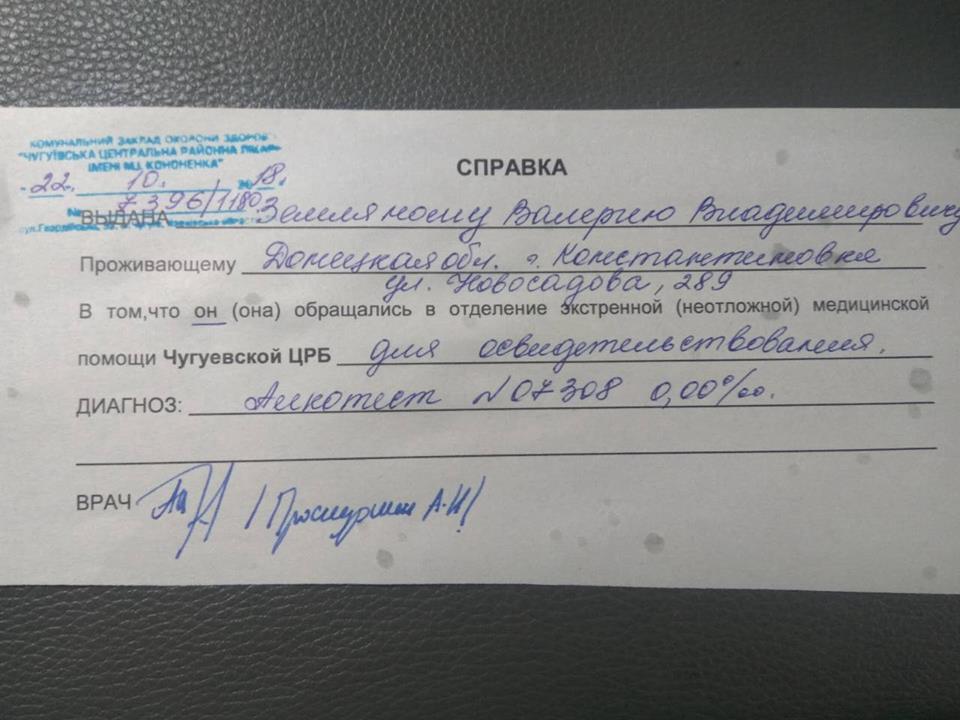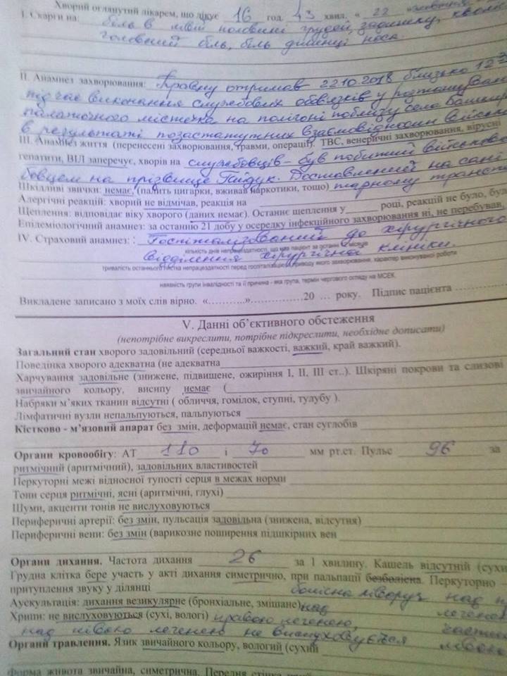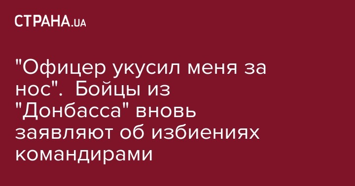 "22 октября в палаточном городке батальона под Башкировкой я дежурил дневальным. В палатку зашел заместитель комбата, старший лейтенант Михаил Стребиж – позывной "Гайдук". Ему показалось, что я пьяный и он тут же начал меня избивать. Бил с такой жестокостью, что сломал ребро, которое порвало мне легкое. Видимо, этого показалось офицеру мало, и он укусил меня за нос. После избиения мне стало плохо, приехали медики и диагностировали разрыв легкого. Экспертиза показала, что я был абсолютно трезвым – акт экспертизы специально вам пришлю. Сейчас нахожусь в Харьковском госпитале, меня лечат. Я написал заявление в ВСП и военную прокуратуру, но делу явно не хотят давать ход – избивший меня офицер по прежнему служит в части", - рассказал "Стране" избитый сержант.