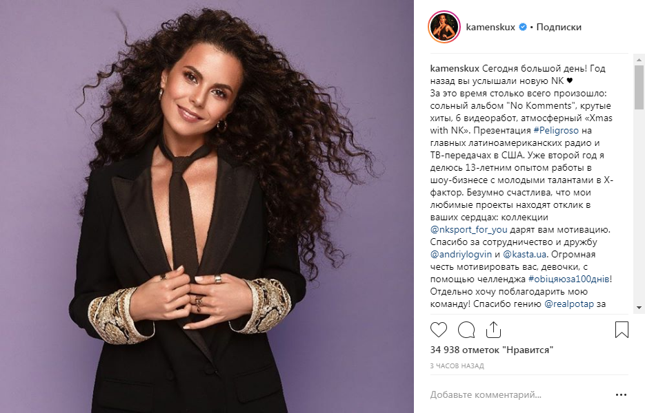 "За это время столько всего произошло: сольный альбом "No Komments", крутые хиты, 6 видеоработ, атмосферный "Xmas with NK". Презентация Peligroso на главных латиноамериканских радио и ТВ-передачах в США. Уже второй год я делюсь 13-летним опытом работы в шоу-бизнесе с молодыми талантами в Х-фактор. Безумно счастлива, что мои любимые проекты находят отклик в ваших сердцах", - сказано в сообщении.