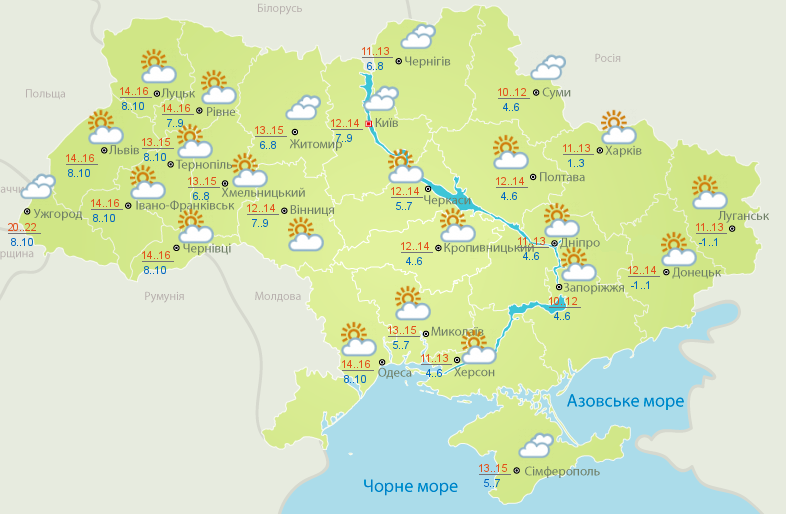 - В центре Украины ясно. Температура воздуха ночью +4…+9 градусов, днем +12…+14 градусов.