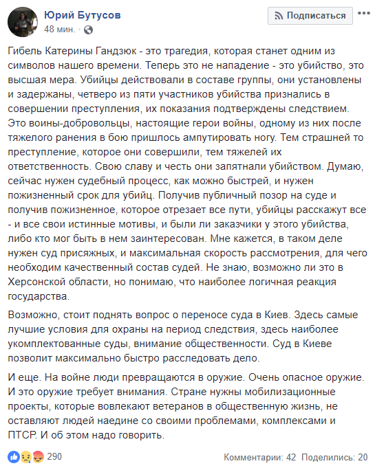 "Гибель Катерины Гандзюк – это трагедия, которая станет одним из символов нашего времени. Теперь это не нападение – это убийство, это высшая мера. Убийцы действовали в составе группы, они установлены и задержаны, четверо из пяти участников убийства признались в совершении преступления, их показания подтверждены следствием. Это воины-добровольцы, настоящие герои войны, одному из них после тяжелого ранения в бою пришлось ампутировать ногу. Тем страшней то преступление, которое они совершили, тем тяжелей их ответственность. Свою славу и честь они запятнали убийством. Думаю, сейчас нужен судебный процесс, как можно быстрей, и нужен пожизненный срок для убийц. Получив публичный позор на суде и получив пожизненное, которое отрезает все пути, убийцы расскажут все – и все свои истинные мотивы, и были ли заказчики у этого убийства либо кто мог быть в нем заинтересован. Мне кажется, в таком деле нужны суд присяжных и максимальная скорость рассмотрения, для чего необходим качественный состав судей. Не знаю, возможно ли это в Херсонской области, но понимаю, что наиболее логичная реакция государства", – пишет журналист Юрий Бутусов.