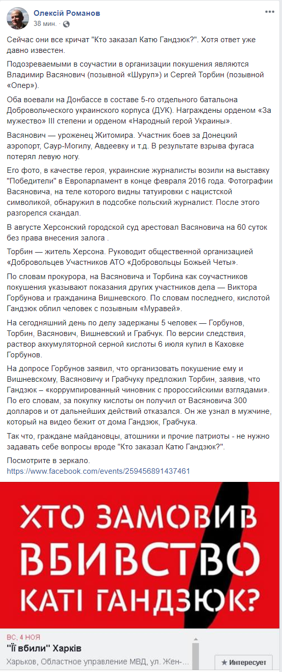 "Сейчас они все кричат: "Кто заказал Катю Гандзюк?". Хотя ответ уже давно известен. Подозреваемыми в соучастии в организации покушения являются Владимир Васянович (позывной «Шуруп») и Сергей Торбин (позывной «Опер»). Оба воевали на Донбассе в составе 5-го отдельного батальона Добровольческого украинского корпуса (ДУК). Награждены орденом «За мужество» III степени и орденом «Народный герой Украины». Васянович – уроженец Житомира. Участник боев за Донецкий аэропорт, Саур-Могилу, Авдеевку и т. д. В результате взрыва фугаса потерял левую ногу. Его фото, в качестве героя, украинские журналисты возили на выставку "Победители" в Европарламент в конце февраля 2016 года. Фотографии Васяновича, на теле которого видны татуировки с нацистской символикой, обнаружил в подсобке польский журналист. После этого разгорелся скандал. В августе Херсонский городской суд арестовал Васяновича на 60 суток без права внесения залога. Торбин – житель Херсона. Руководит общественной организацией Добровольцев-участников АТО «Добровольцы Божьей Четы»", – пишет юрист Алексей Романов.