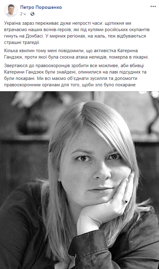 "Україна зараз переживає дуже непрості часи: щотижня ми втрачаємо наших воїнів-героїв, які під кулями російських окупантів гинуть на Донбасі. У мирних регіонах, на жаль, теж відбуваються страшні трагедії. Кілька хвилин тому мені повідомили, що активістка Катерина Гандзюк, проти якої була скоєна атака нелюдів, померла в лікарні. Звертаюся до правоохоронців зробити все можливе, аби вбивці Катерини Гандзюк були знайдені, опинилися на лаві підсудних та були покарані. Ми всі маємо об’єднати зусилля та допомогти правоохоронним органам для того, щоби зло було покаране", – написал у себя в Facebook президент Украины президент Петр Порошенко.