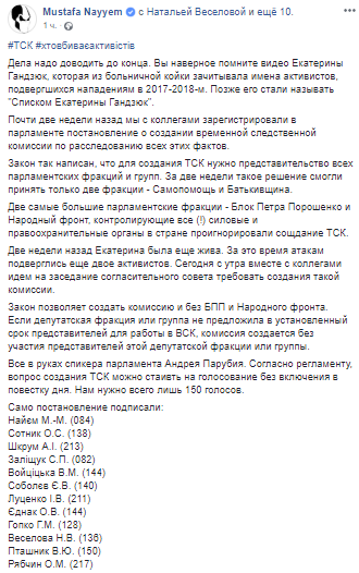 "За две недели такое решение смогли принять только две фракции - Самопомощь и Батькивщина. Две самые большие парламентские фракции - Блок Петра Порошенко и Народный фронт, контролирующие все (!) силовые и правоохранительные функции в стране проигнорировали создание ТСК", - написал Найем.