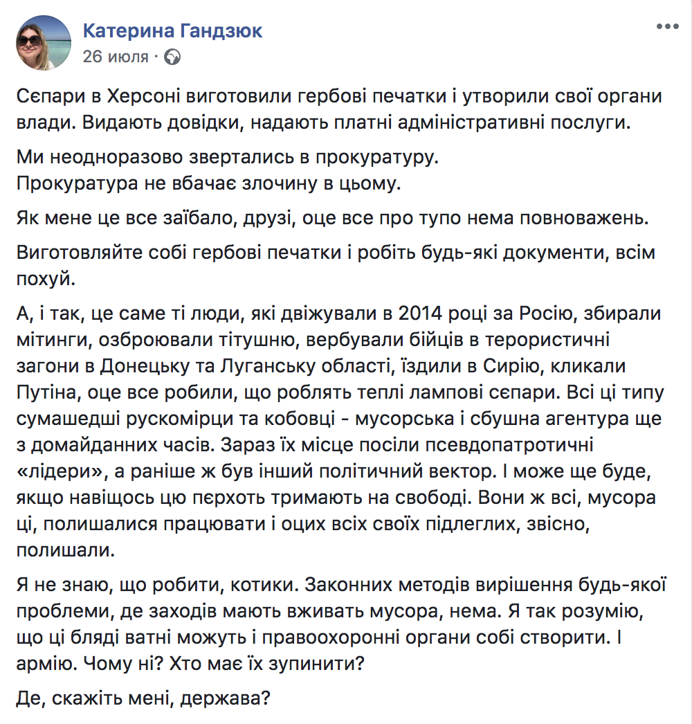Что касается "сепаров", то, например, 26 июля она писала, что они снова поднимают голову. При этом она обвинила в их крышевании "мусоров".