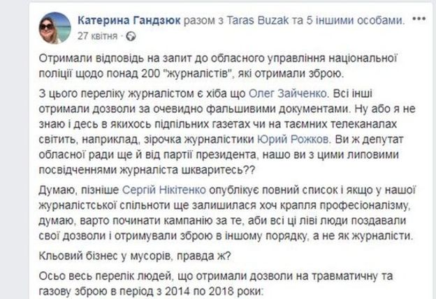 Но вернемся к полиции. Гандзюк обвиняла ее руководство в бесконтрольной раздаче травматического оружия якобы фейковым журналистам, а на деле - титушкам.