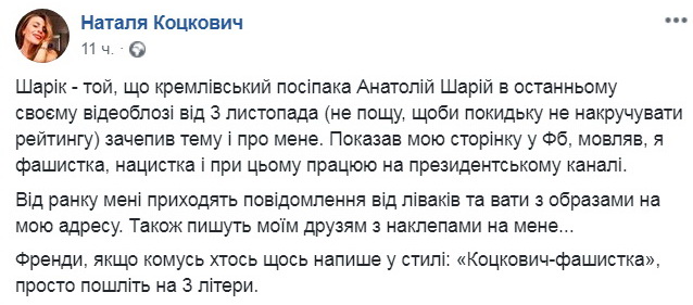 "Показал мою страницу в ФБ, мол, я фашистка, нацистка и при этом работаю на президентском канале. С утра мне приходят сообщения от леваков и ваты с оскорблениями в мой адрес. Также пишут моим друзьям с клеветой на меня… Френды, если кому-то кто-то что-то напишет в стиле "Коцкович-фашистка", просто пошлите на 3 буквы", – предложила журналистка.