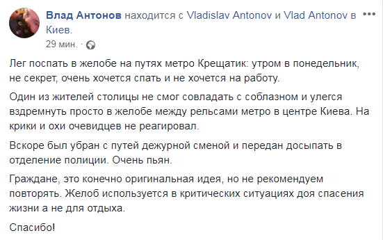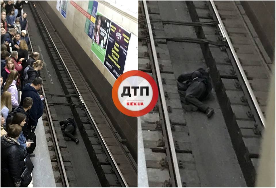 В центре Киеве на станции метро "Крещатик" неизвестный мужчина лег в спасательный желоб. Он был очень пьян и не реагировал на "крики и охи" очевидцев. Об этом говорится на Facebook-странице журналиста Влада Антонова.