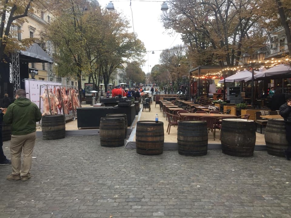 В Одессе администрация ресторана "Стейк хаус" перекрыла проход по Дерибасовской тушами животных в честь юбилея. Здесь установили сцену и настил для празднования. Об этом сообщает активист Демьян Ганул на своей странице в Facebook.