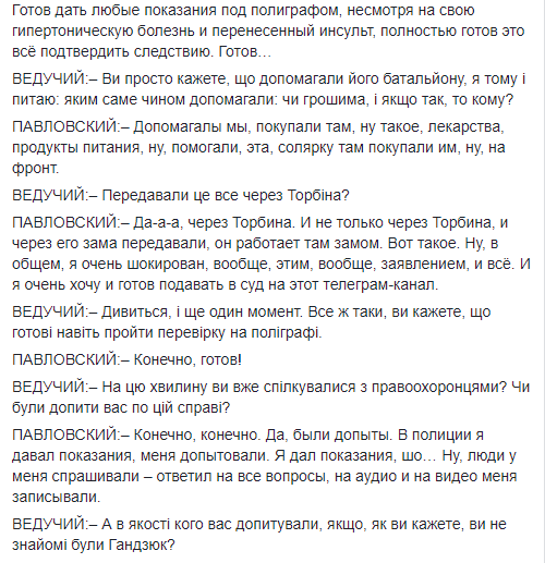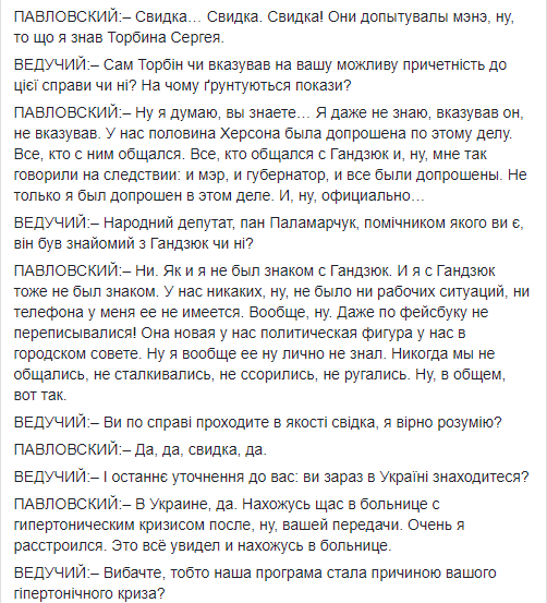 ПАВЛОВСКИЙ: – Да, я только что узнал об этой ереси и, конечно, заявляю прямо, что к ситуации с Гандзюк не имею вообще никакого отношения. Даже не был с ней никогда знаком. Торбина знаю как народного героя Украины, который там обвиняется или как это… Дважды участвовал с ним в поддержке детских спортивных мероприятий. Знаю его как народного героя Украины. У нас официально находятся в одном здании: мы на первом работаем, он – на втором. Он часто приходил-обращался, ну они звернення писали с активистами, всё, помогали им на фронт. На фронт ихнему батальону.