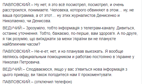 ПАВЛОВСКИЙ:– Ну нет, я это всё посмотрел, посмотрел, и очень расстроился, понимаете. Человека, которого обвиняют в этом… ну, не ваша программа, а от этот… ну этих журналистов Денисенко и Николаенко, чи Денисова.