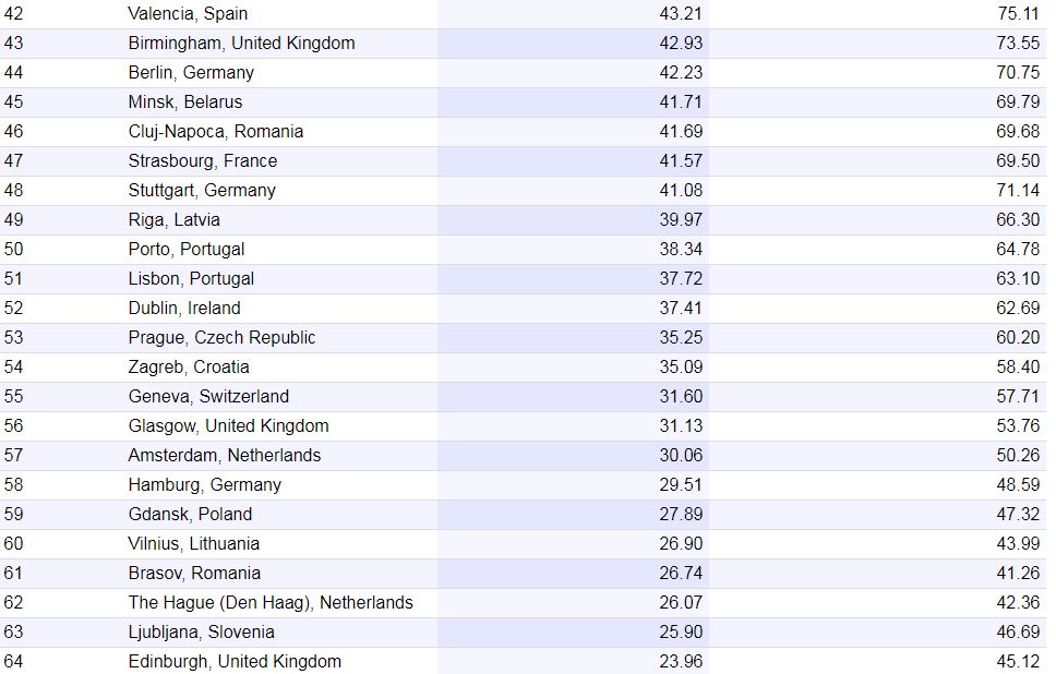В рейтинг также попали два украинских города - Львов (58,08 пунктов) на 30 месте и Харьков (56,05) на 31 месте.