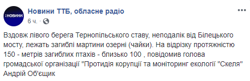 Вдоль левого берега Тернопольского пруда, неподалеку от Билецкого моста в Тернополе нашли погибшими озерных чаек. Об этом во вторник, 6 ноября, сообщил председатель общественной организации Противодействие коррупции и мониторинг экологии Скала Андрей Обьещик, информируют Новости ТТБ в Facеbook.