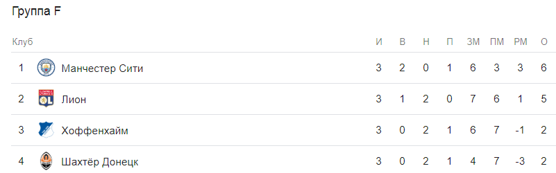 23 октября: Хоффенхайм - Лион - 3:3; Шахтер - Манчестер Сити - 0:3.