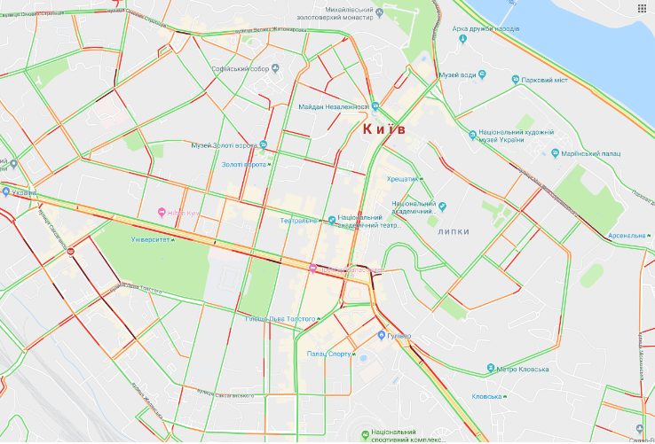 Утром 8 ноября в Киеве образовались огромные пробки. Основные заторы наблюдаются на мостах через Днепр, а также в центре столицы. Об этом свидетельствуют данные на Google Maps.