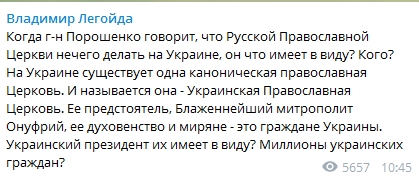 Председатель Синодального отдела Украинской православной церкви (МП) по взаимоотношениям церкви с обществом и СМИ Владимир Легойда констатировал, что заявление украинского президента Петра Порошенко о том, что "представителям РПЦ нужно покинуть страну", вызывают недоумение. Об этом говорится в сообщении в его Telegram.