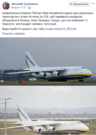 Американская певица Тейлор Свифт арендовала сразу два украинских транспортных самолета  Ан-124, чтобы перевезти концертное оборудование в Окленд, Новая Зеландия. Об этом сообщил авиационный энтузиаст Виталий Трубников в Facebook.
