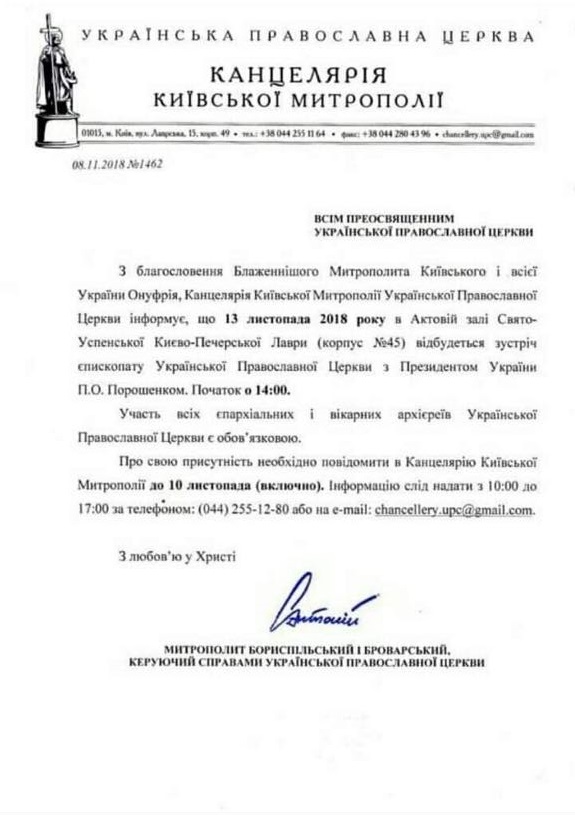 Судя по имеющемуся в распоряжении редакции документу, с благословения Блаженнейшего Митрополита Киевского и всея Украины Онуфрия, епископат Украинской православной церкви cобирают на встречу с Порошенко на 13 ноября.